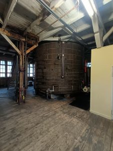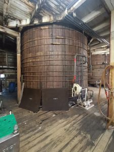 Aktuell gilt unser besonderes Augenmerk dem noch betriebsfähigen Essigbereiter der Firma Leman. Es handelt sich hierbei um ein 60 m³ fassendes Holzfass, in dem sich grobe Hobelspäne befinden. An diesen Spänen sitzen die Essigsäurebakterien. Der Essiggrundstoff – 15%iger Alkohol – wird permanent mit Hilfe von Pumpen über die Hobelspäne gerieselt, dabei setzen die Essigsäurebakterien den Alkohol in Essig um. Dieses Produktionsverfahren wird auch Fesselverfahren genannt, da die Essigsäurebakterien fest an den Spänen „gefesselt“ sind.